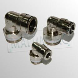 Как вариант, можно использовать угловой фитинг для пневмосистемы. С одной стороны резьба 1/4'' или 1/8'', а с другой цанговый зажим под пневмагистраль (трубку).