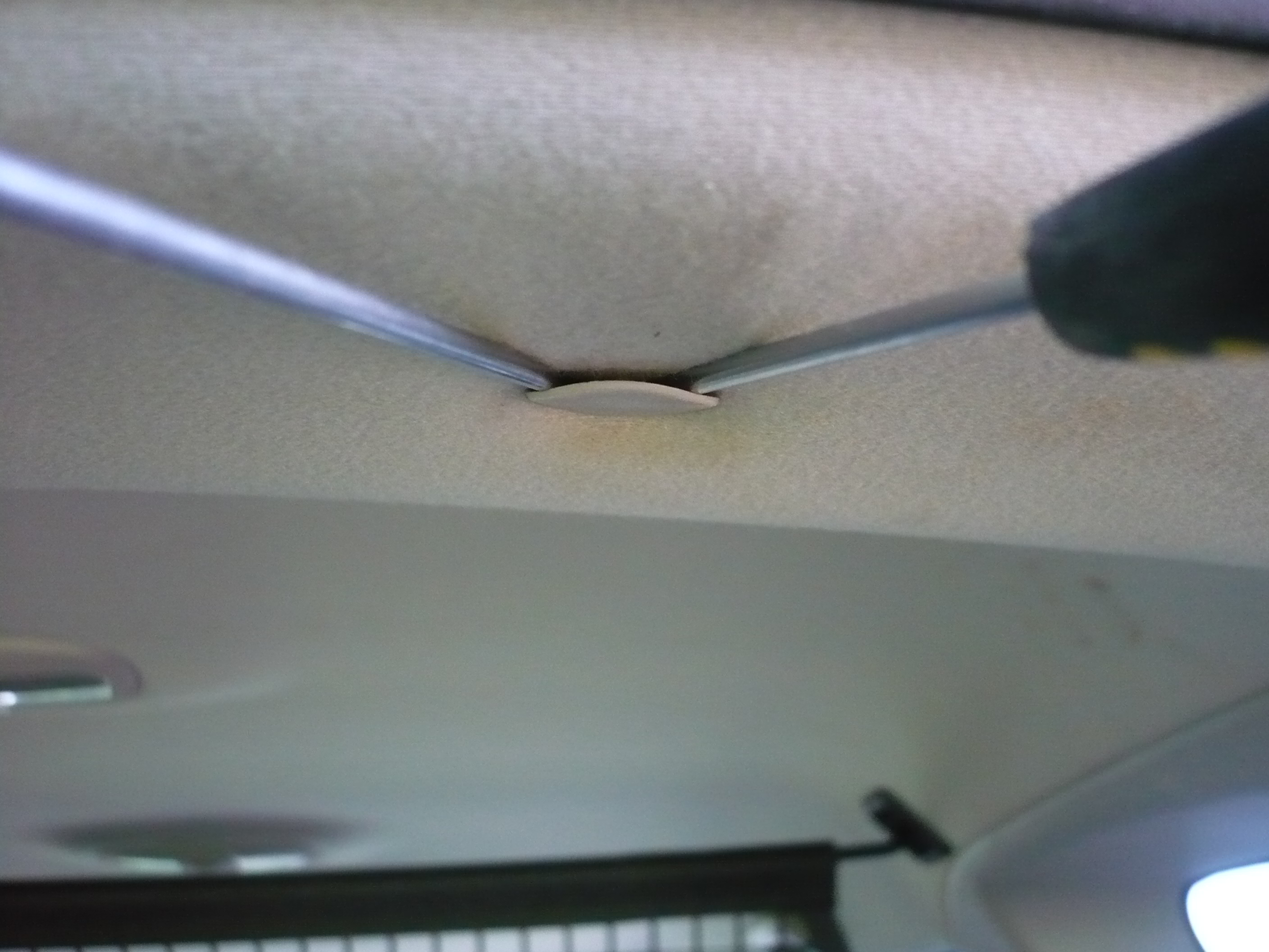 Снимаем плавник. Для этого вытаскиваем пистоны обивки потолка, для этого их удобно подковырнуть двумя тонкими отвертками