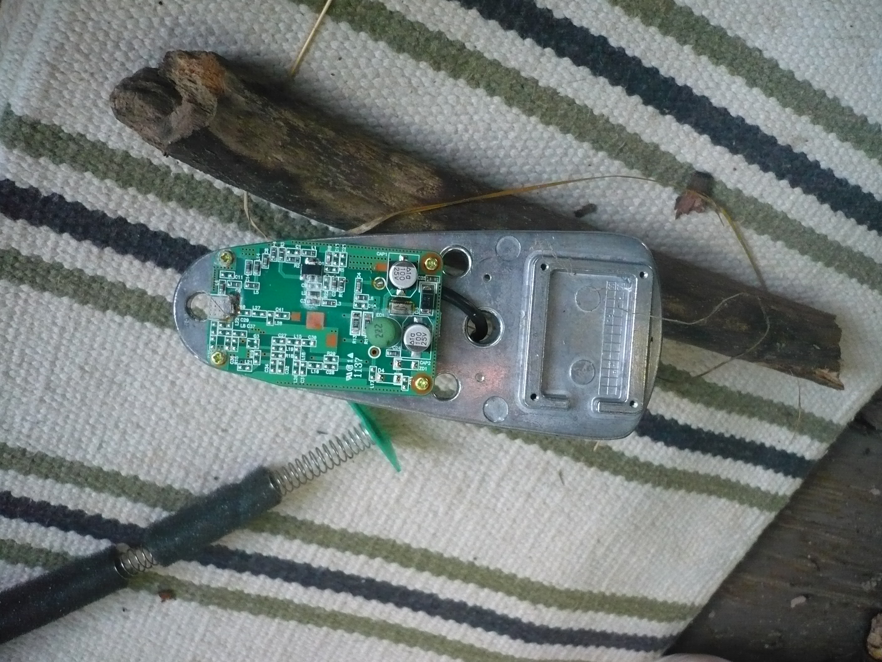 С нижней стороны откручиваем тонкой крестовой отверткой 8 саморезов и снимаем нижнюю пластиковую крышку с резиновой прокладкой, АККУРАТНО! В верхней части находится антенна, а в нижней плата! НЕ ОТОРВИТЕ!!! У меня, кстати, антенна оказалась уже оторвана от платы, вернее отвалилась по пайке!