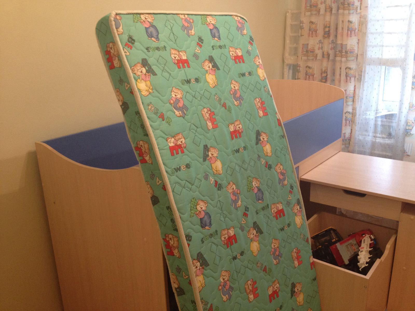 С кроваткой идет так же матрац двусторонний (мягкая сторона и жесткая, наполнение кокос) матрац в отличном состоянии.