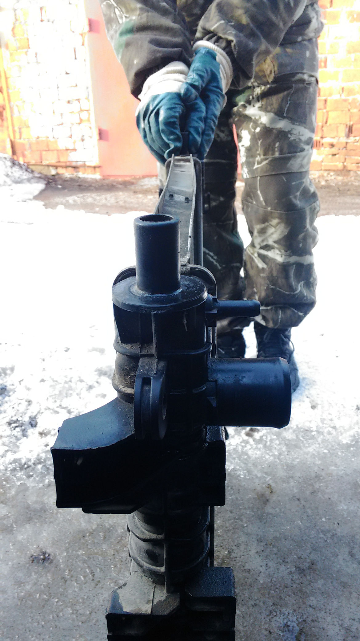 Начал искать причину, оказалось что патрубок интеркуллера, установленный до специального ограничителя на радиаторе, тянет всю конструкцию внутрь, напрягая её на излом. До крепления на турбине дотянутся было сложно и я немного сдвинул патрубок с радиатора, удалось поставить штырь ровно по середине рамки. Сопоставив изгиб испорченного радиатора с местом правого верхнего крепления, подумал что оно вполне могло понемногу выгибать радиатор.