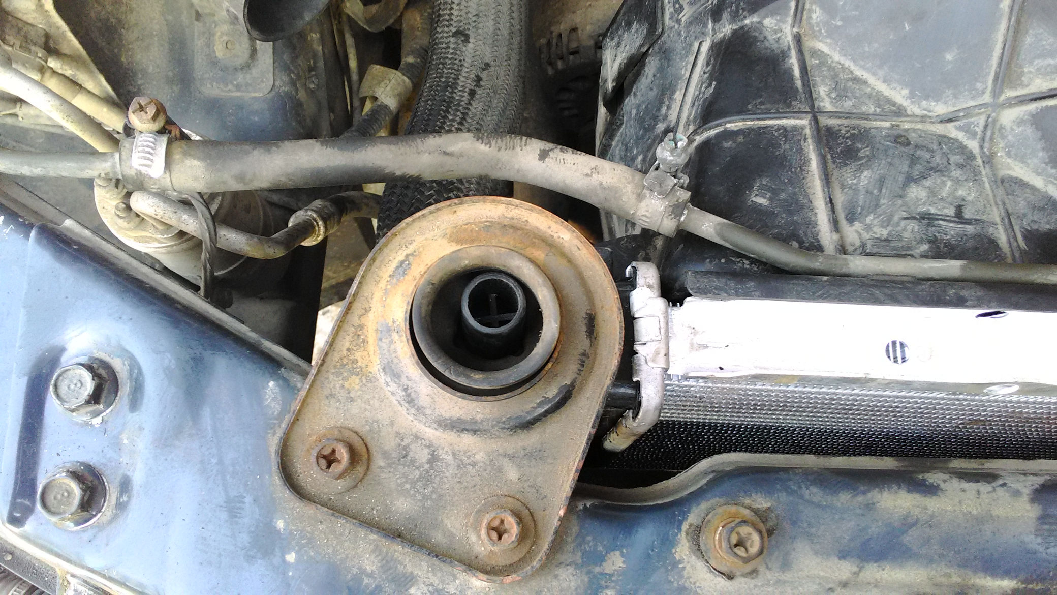 После установки нового радиатора, заметил что верхний правый штырь крепления (относительно движения авто), стоит в плотную к рамке его держащей, тем самым не имеет свободного хода, в отличии от левого.