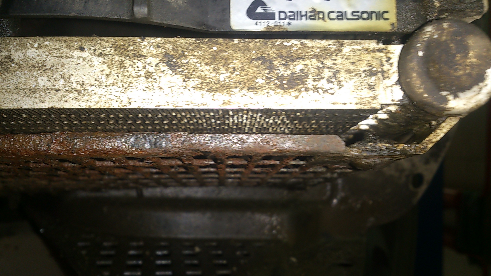 После тестирования в соответствующей фирме сабконденсор приговорили - ремонтировать бесполезно, по давлением травит в 4-х местах по полю, и в 2-местах по трубкам. Пробовали варить - шов ползет, прицепиться не за что. Предложили сделать змеевик а-ля самогонный аппарат, но стоимость - половина нового. В итоге сошлись на том, что замкнут контур для обеспечения циркуляции фреона и на этом всё. Стоило мне это в комплексе (радиатор + пескоструй решетки) 5000 руб. Итоговый вид радиатора:
