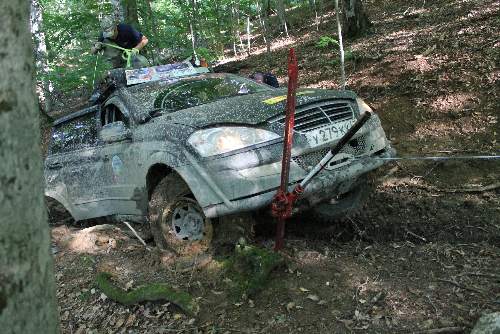 Разборт с вылетом из колеи на скользком подъеме с крупными булыганами и корнями.... На скорости на второй пониженной с резиной на 1,2 атмосферы. Весело было... Потом там же лебедили володю габадея....