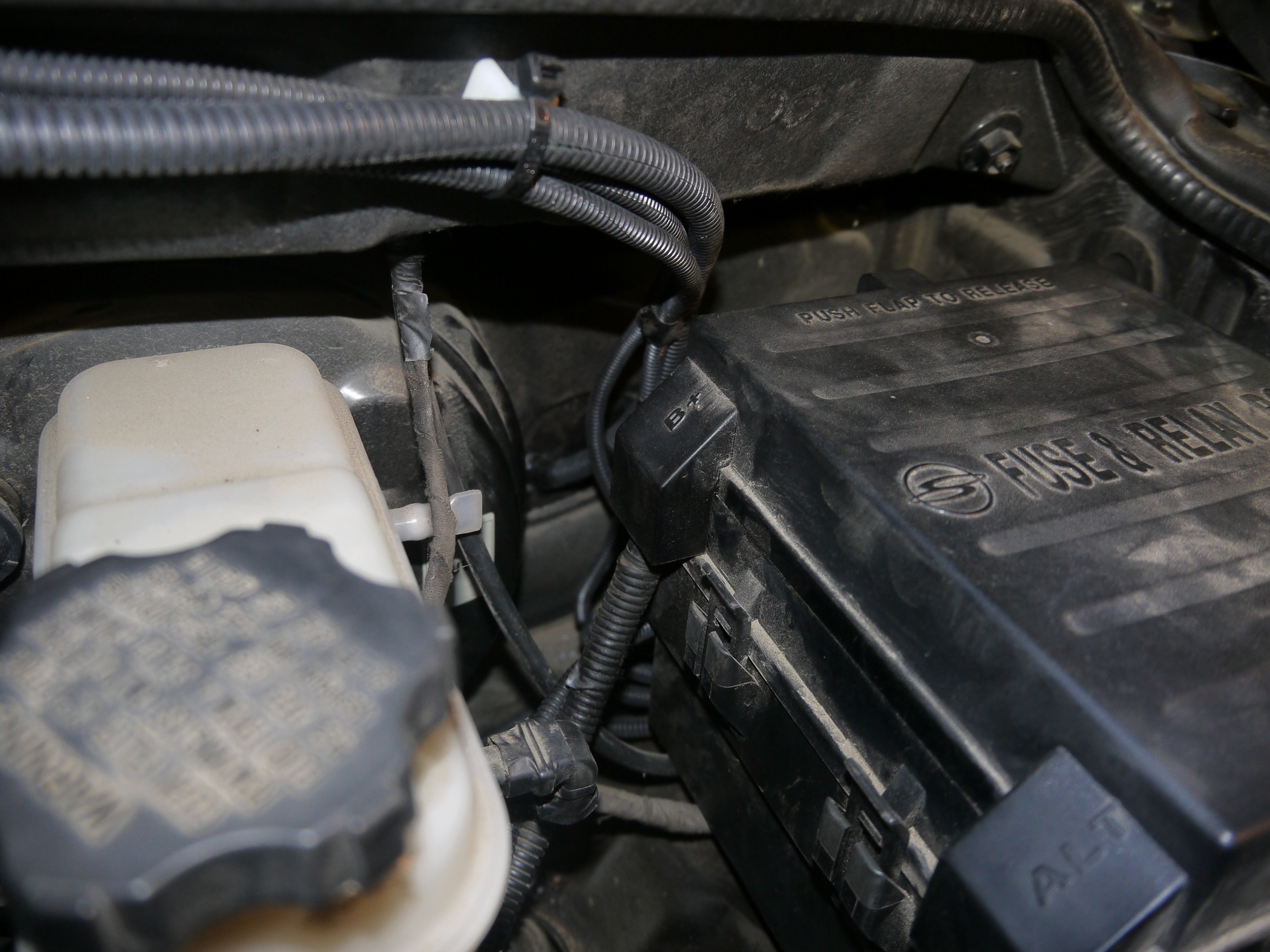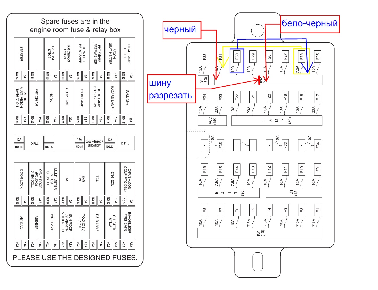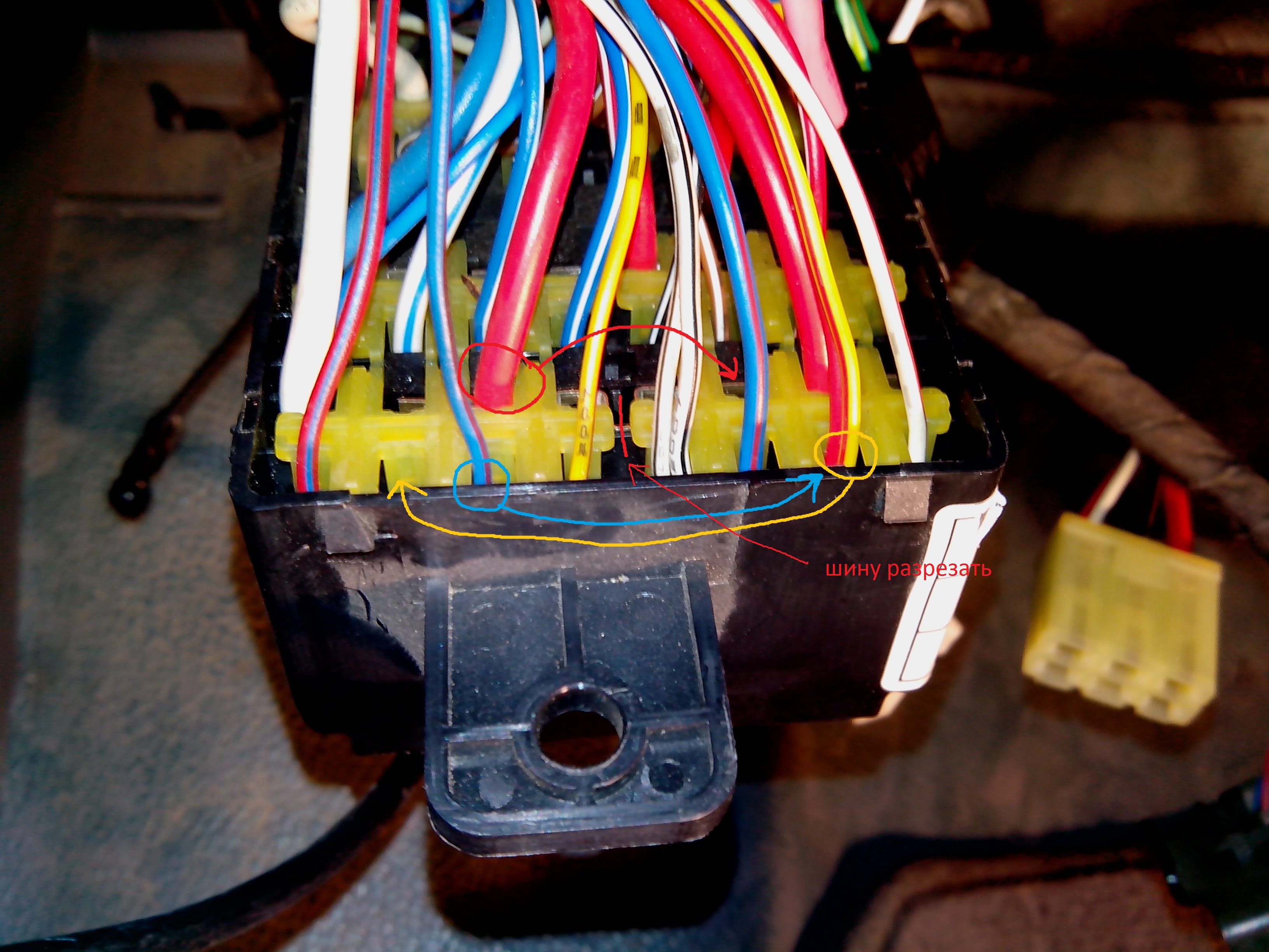 Вот практика, тыльная сторона салонного блока предохранителей до доработки с разметкой, что нужно сделать: