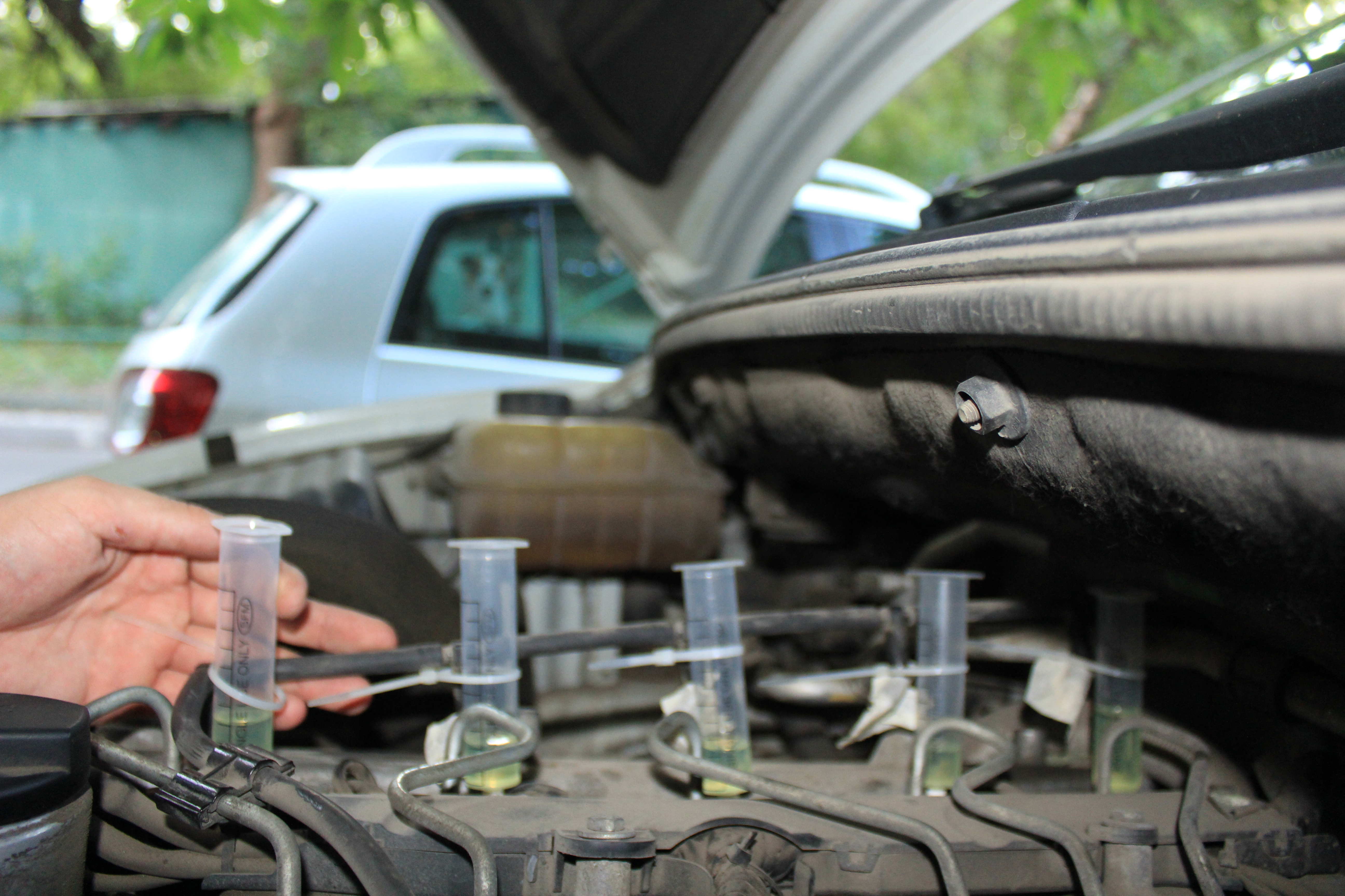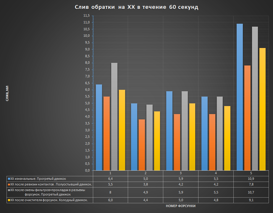 Сделал элементарный слив форсунок - сильно переливает 5-я! Если первые 4-е за работу на холостых за 1 минуту выливают в обратку около 1-4 мл, то 5-я льет больше 20 (точно не скажу - шприц только на 20 деление), переполняется он на 50-й секунде работы двигателя!