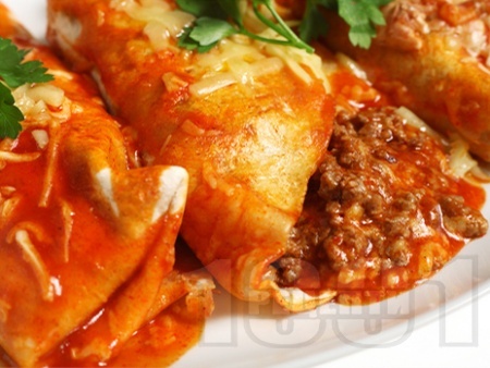 енчилада - мексиканский рулет с сочной начинкой, запечённый под оригинальным соусом.