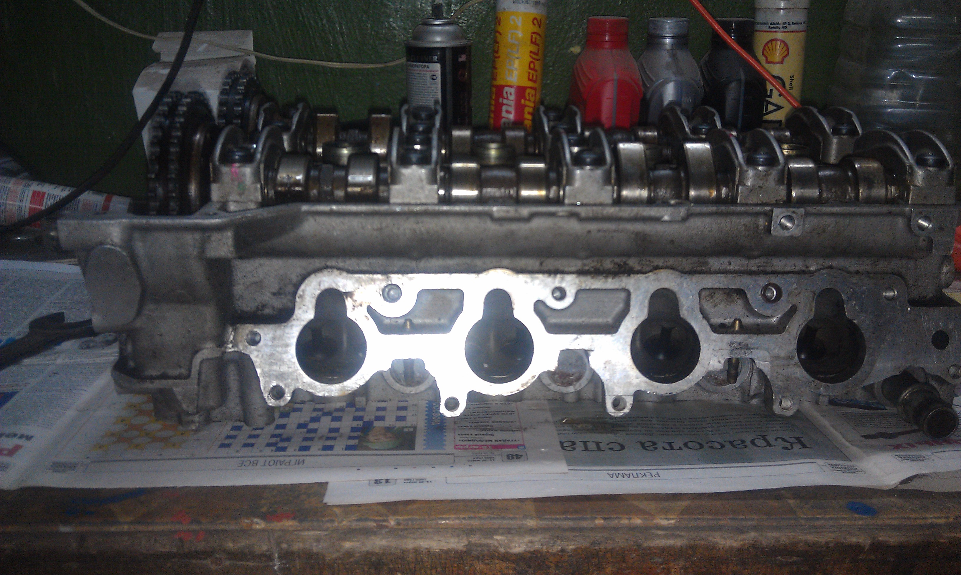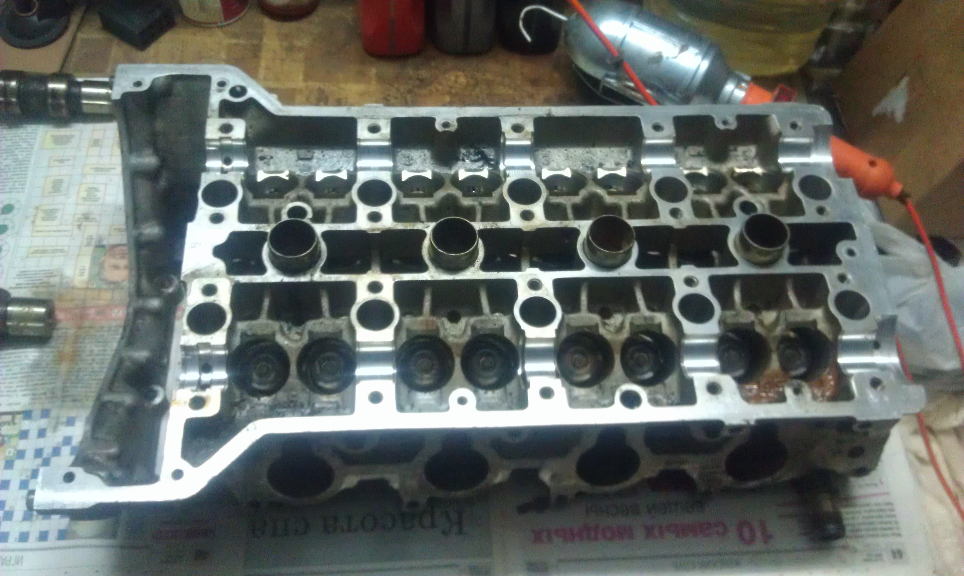А вот с выпускными дело оказалось сложнее. Седла притерлись нормально, а вот клапана (практически все 8) имели небольшие кратеры. Теперь вот уже какой день притираю вручную при помощи кусочка шланга.