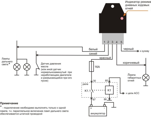 работа штатных ламп дальнего света в режиме дневных ходовых огней;