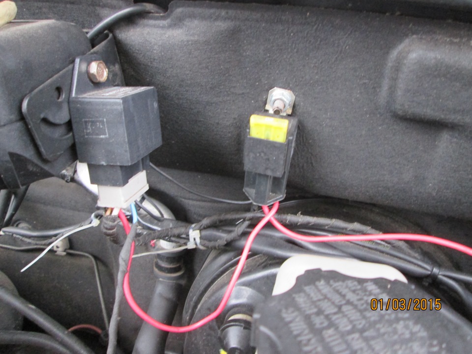 Подключил плюс из реле (КРАСНЫЙ ПРОВОД) к клемме аккумулятора идущей в блок предохранителей. Из реле плюс идёт на БЛОК DRL
