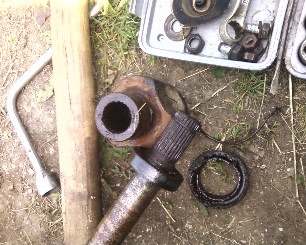 Всем привет. Обнаружил недавно большой люфт на передней, внутренней гранате ШРУСа с правой стороны.Там же были и подтёки масла из моста, ещё и маленькая дырочка на внутреннем пыльнике того же ШРУСа. После общения с Андреем (охотник) по синдромам мог быть очень плачевный исход, а именно замена ШРУСа, полуоси,подшипника и пыльника полуоси. В общем надо разбирать и смотреть посоветовал Андрей. Да, заодно решил и передние стойки поменять,а то совсем рекс валким стал. Так как пыльник на полуоси ещё по осени посопливился да перестал,поэтому подшипник и этот пыльник у меня уже были куплены, а когда пришли стойки,то и начал разбор. Описывать процес разбора не буду, т.к. об этом уже много понаписано на разных ресурсах,хочу остановится на засадных местах. Когда уже было практически всё разобрано, ни как не вынимался ШРУС, ну а так как пыльник шруса шёл под замену,то в этом месте шрус и разобрал, то есть вынул его из внутренней гранаты. Сам шрус оказался в рабочем состоянии и это очень обрадовало. Далее надо было выдернуть внутреннюю гранату из моста, и тут началось самое интересное. В ход пошли все имеющиеся подручные средства, и монтажки, и фомки, ломики и кувалды...Граната ни с места, ну а так как и время было уже 22.00, пошёл отдыхать, а заодно и ещё раз поискать на форумах такую же проблему. Как оказалось,снимать гранату легче всего спец приспособой в виде вилки. На следующий день ещё несколько раз попытался сдёрнуть гранату, только время убил, плюнул, пошёл сварил вилку... и бац,с первого удара граната соскочила довольно спокойно. Вид открылся довольно ужасающий, шлицы на гранате и на полуоси были все в ржавчине. Достал полуось,подшипник очень сильно болтается,весь ржавый,сама полуось тоже вся в ржавчине,но на той стороне которая заходит в диф, перед шлицами имеется проточка под сальник, и после неё,то есть уже шлицы,находятся в масле и очень хорошем состоянии. Получается, что сальник стоит сразу после дифа, а дальше до подшипника, ни какой смазки нет, а на конце полуоси, стоит не сальник, а пыльник,предохраняющий шлицевое соединение между полуосью и ШРУСом от грязи. Дальше прикрепляю фотки(если получится)