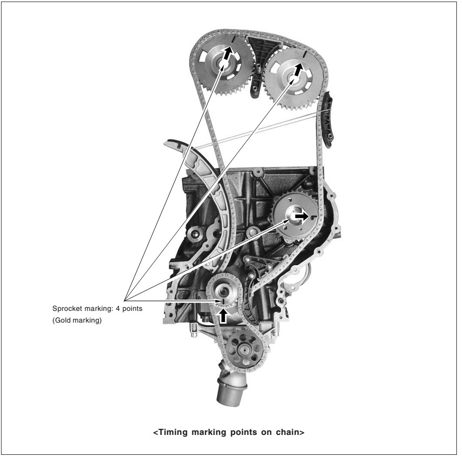 Дмитрий, я не про то, что написал Олег, хотя он пишет правильно. Он же не видит что у Вас и как, поэтому он пишет Вам то, что и как должно быть. Но метки на распредвалах, шестернях и прочее должны быть так, как расписано в документе (у меня он называется Ssang Yong 13) начиная с 5. Install the intake and exhaust camshaft sprockets and the timing chain и далее.